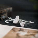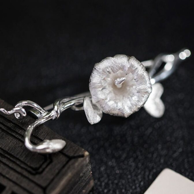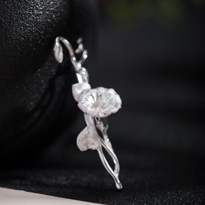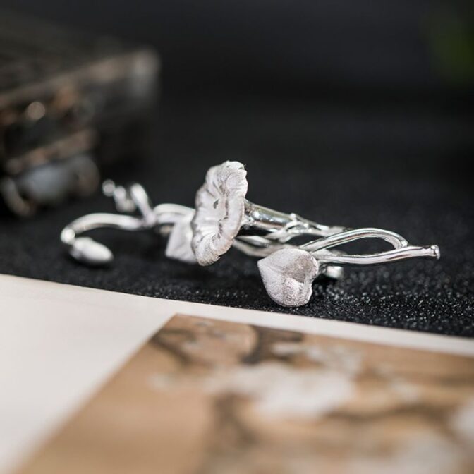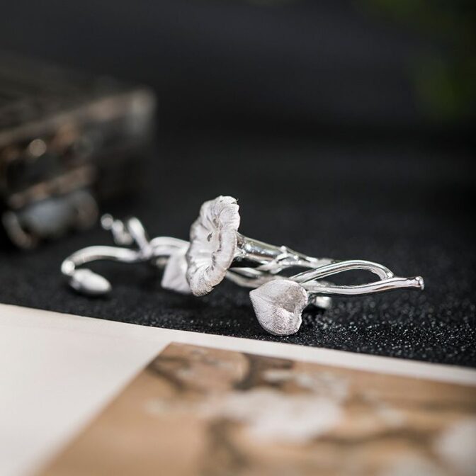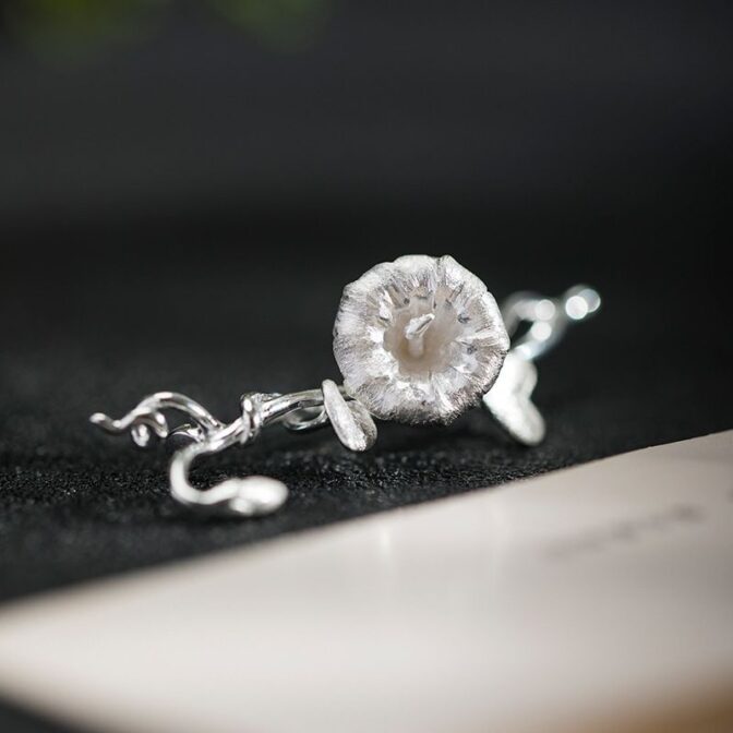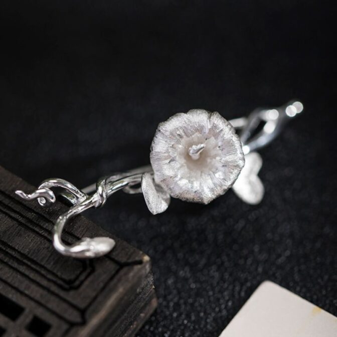 アサガオの花は、清楚で繊細な美しさを持つ花として知られています。その独特の形状や色合いは、芸術家やデザイナーにとっても魅力的なモチーフとなっています。このブローチは、アサガオの花をリアルに表現したシルバーアクセサリーであり、そのデザインは細部までこだわり抜かれています。アクセサリーを身につけることで、日常の装いに華やかさや個性を添えることができるでしょう。アサガオの花の美しさを身近に感じられる、特別な一品と言えるでしょう。