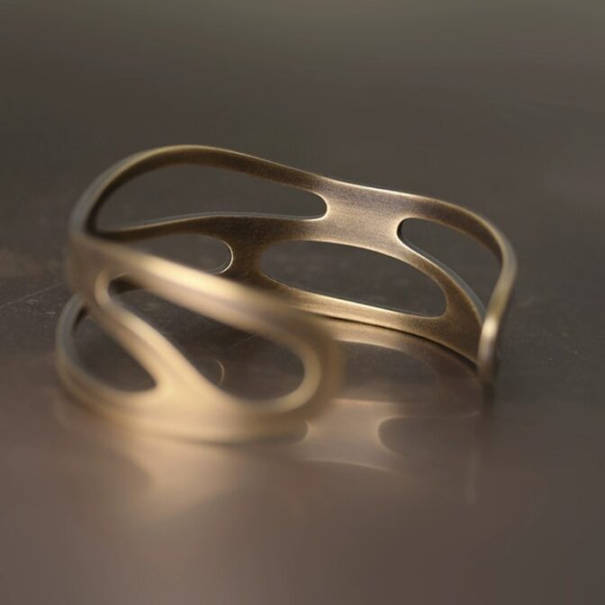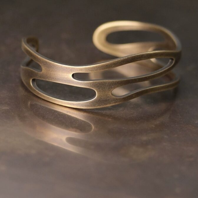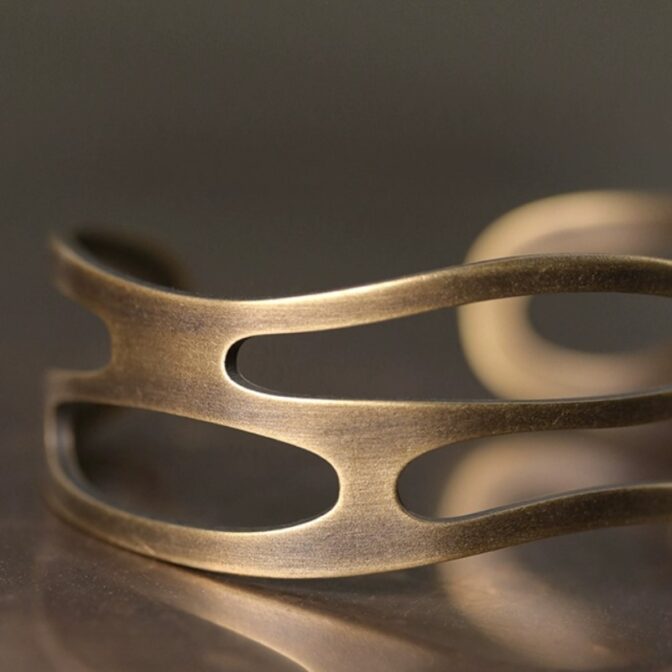 このバングルは、黄銅の板に美しい模様を透かしたアンティーク調のデザインです。