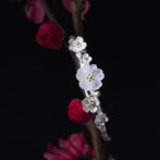 初めて見た時、惚れました。花期が短くて年中に見られません。いつでもどこでもその美しさを見れるように、アクセサリーにしました。水晶という素材を使用して「サンカヨウ」の特性を生かしながら制作しました。水晶をマット仕上げにし、白くて透明感のあるお花を表現しました。水にぬれると透明になります。「サンカヨウ」の特性を最大限に表現できました。