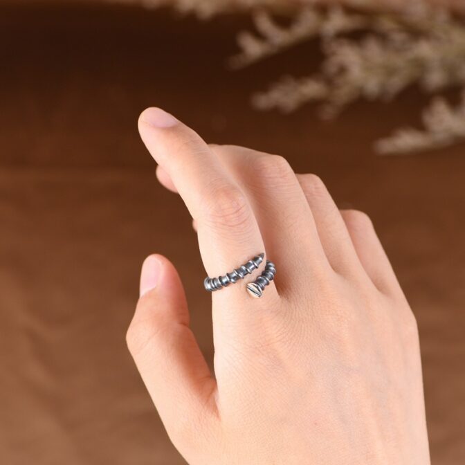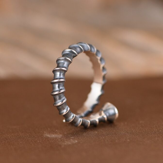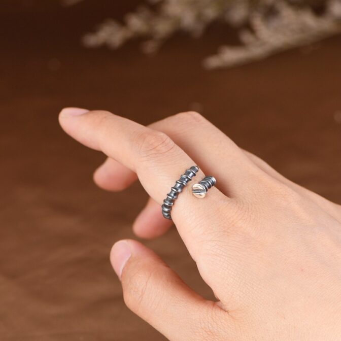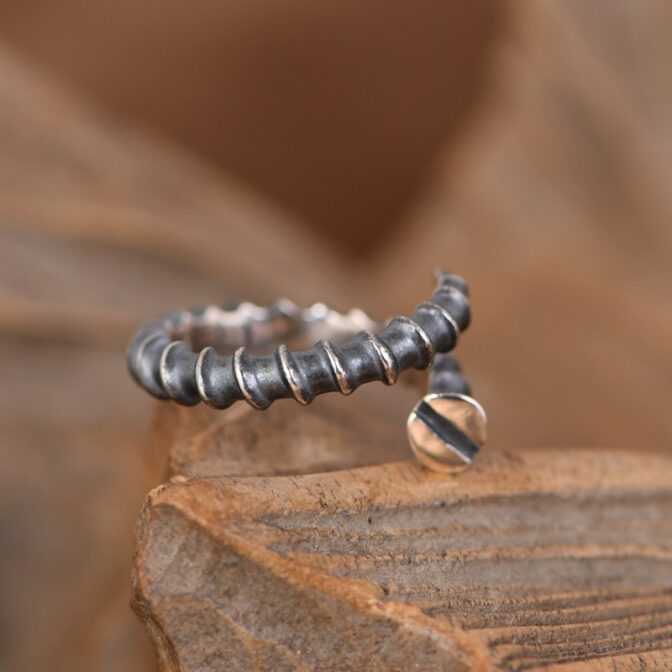このリングは、ネジをモチーフにしたデザインが特徴的で、個性的。素材には、高品質なスターリングシルバーを使用が使用し、耐久性に優れています。普段使いにはもちろん、特別な場にもふさわしいアクセサリーとなっています。