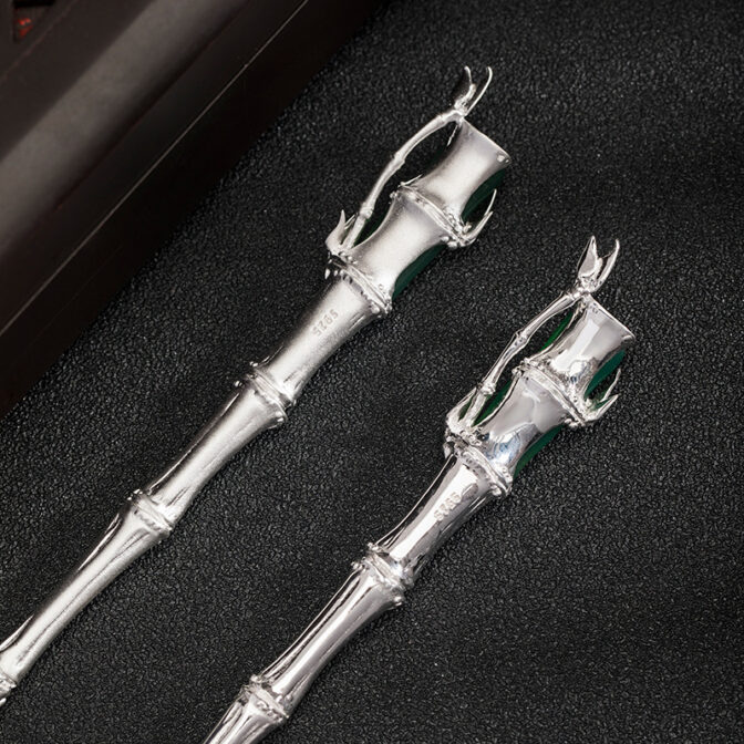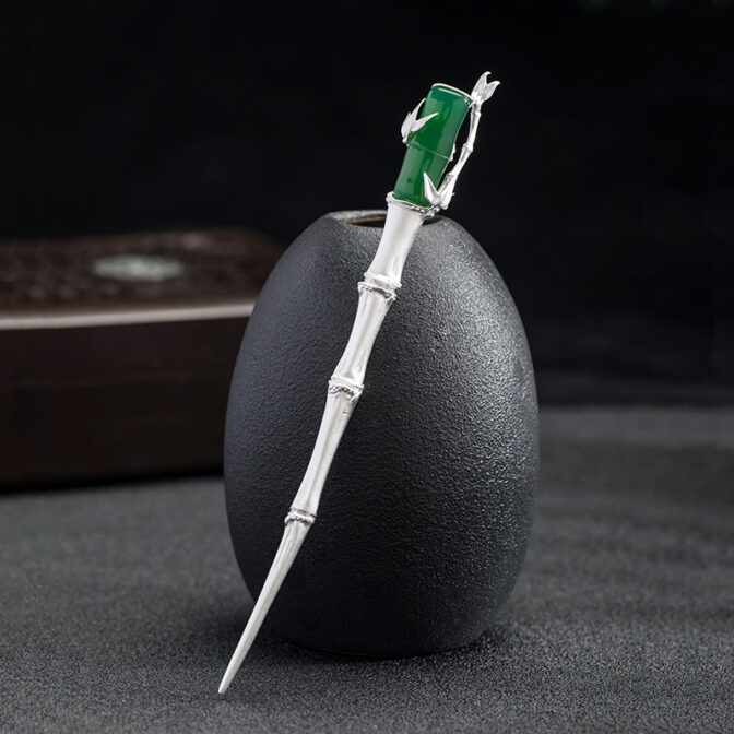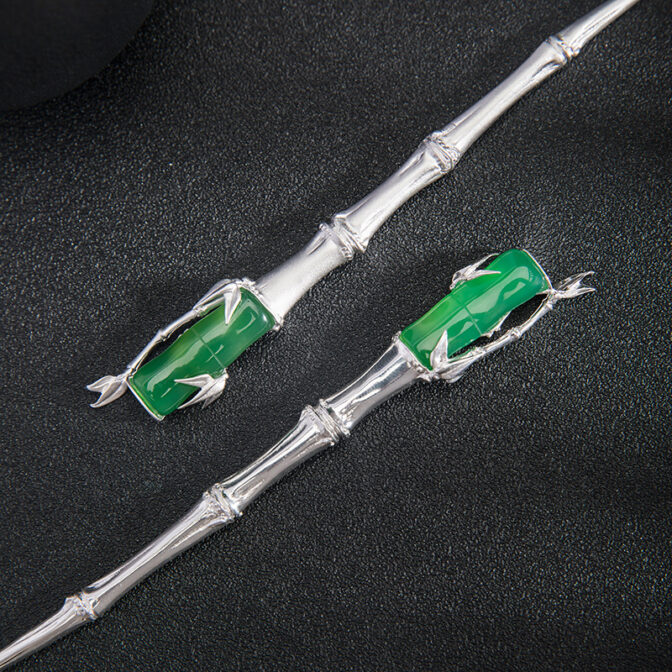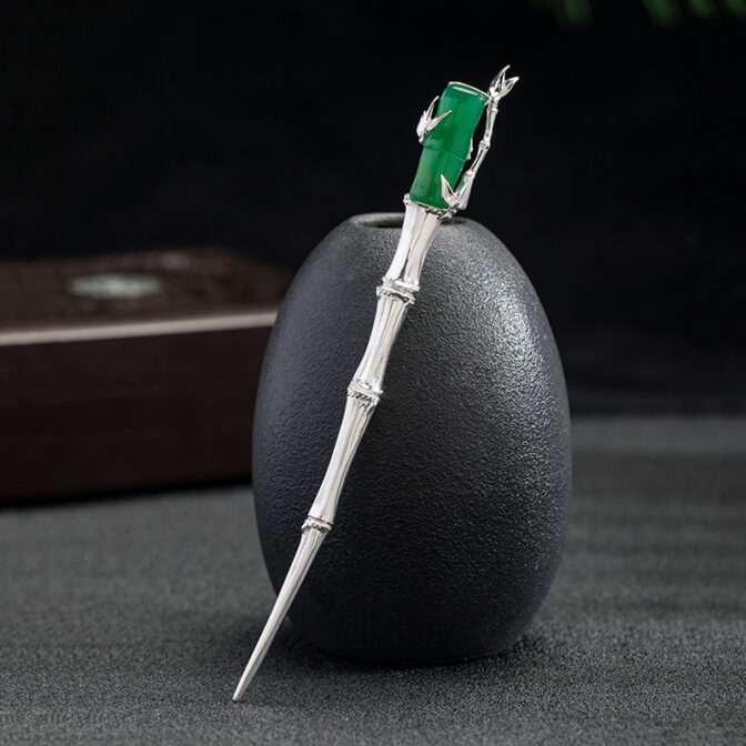 自然素材の竹を使用した上品なかんざし、グリーンメノウとスターリングシルバーを使用し、繊細で美しい仕上がりになっています。