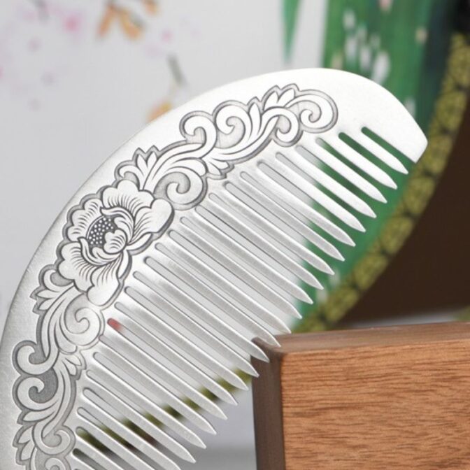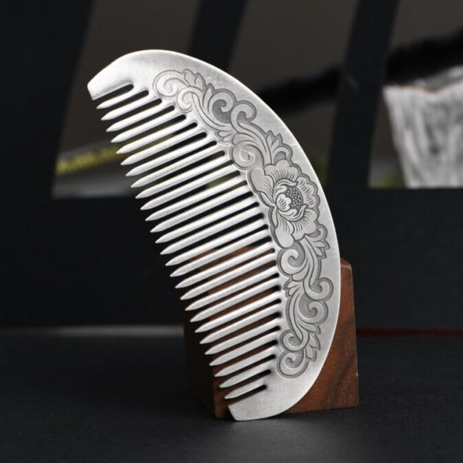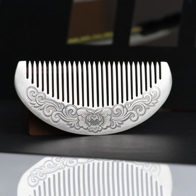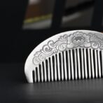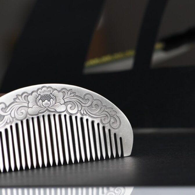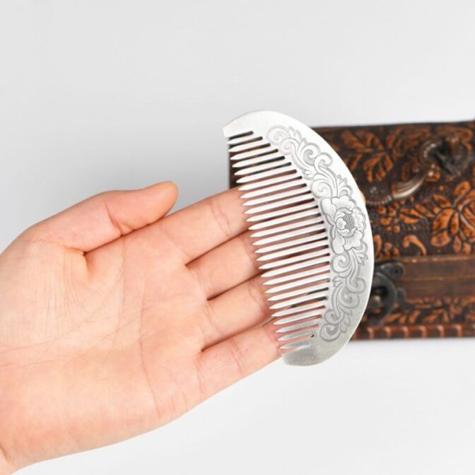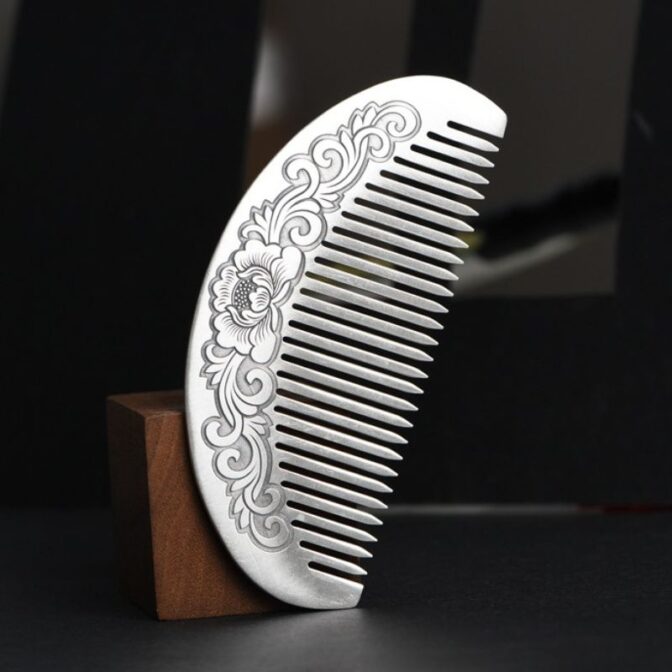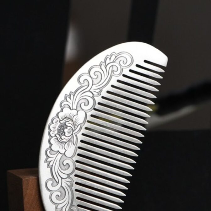 蓮の花の彫刻が施した純銀の櫛は、優雅で美しいデザインです。この櫛は、贅沢な手触りと繊細な彫刻が相まって、まるで芸術作品のような雰囲気を醸し出しています。髪を梳く際に、この櫛が持つ優しさと気品が、毎日の身だしなみの時間を特別なものに変えてくれることでしょう。ぜひ、この素敵な櫛をお手元に置いて、日常の中に少しの贅沢を取り入れてみてください。