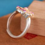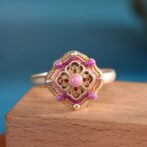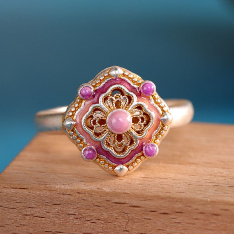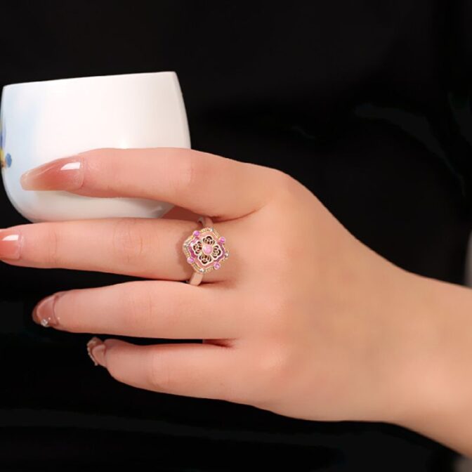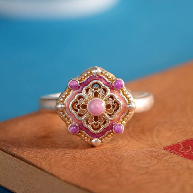 繊細な透かし模様と可愛らしい七宝焼が施されたリングは、実に魅力的です。そのリングを指にはめると、まるで物語の一部になったかのような気分になります。光が当たるたびに、七宝焼の色彩がきらめき、見る人を惹きつけます。繊細な透かし模様は、時代を超えた美しさを感じさせ、職人の技術と情熱が伝わってきます。このリングを身につけることで、自分自身がより特別な存在になったような気持ちになり、日常の中で少しの贅沢を楽しむことができるのです。