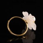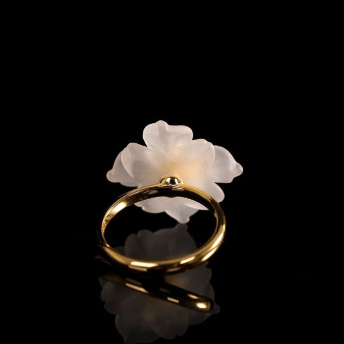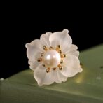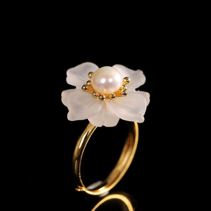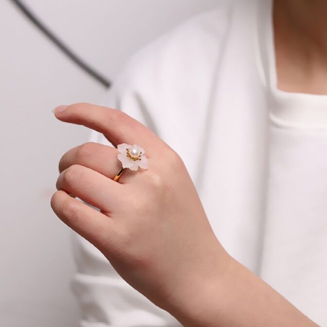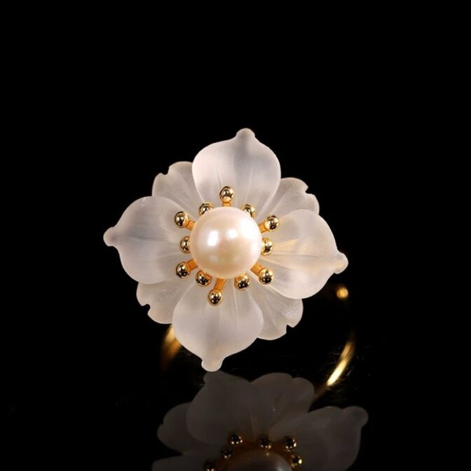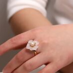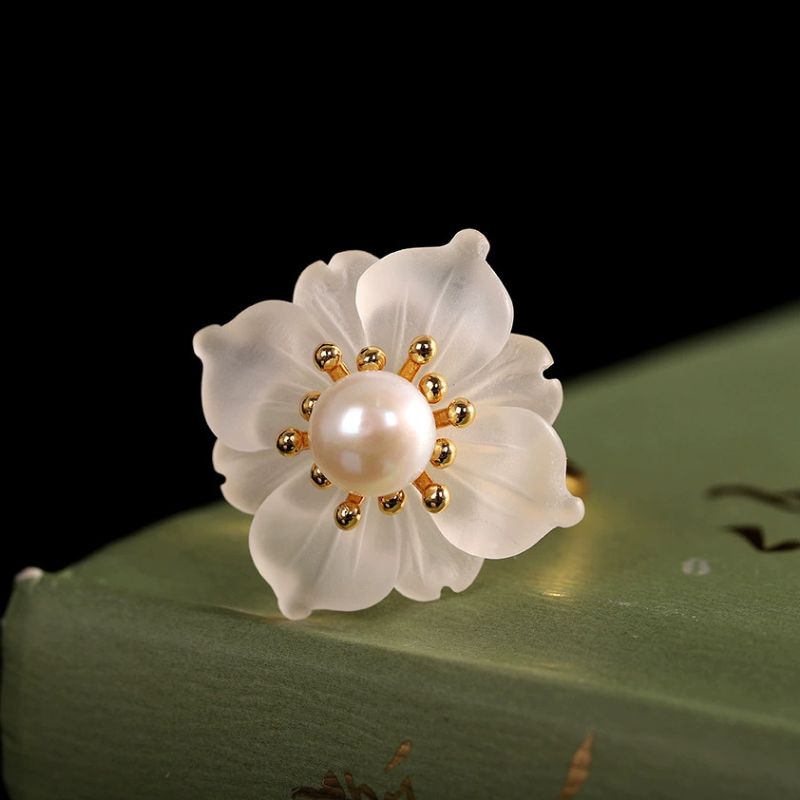 風車の花のリングは、動きのあるデザインが特徴で、光の角度によって異なる表情を見せるその様子は、自然の変化を思わせます。水晶の花びらは、光を受けると優雅に輝き、まるで風に揺れる花のように見えます。パールで飾られた中心部は、柔らかな光沢を放ち、優雅さを一層引き立てます。このアクセサリーは、洗練された美しさを求める方にぴったりで、特別な日の装いを華やかに演出してくれるでしょう。