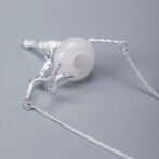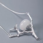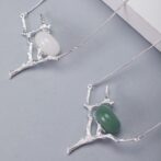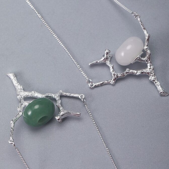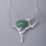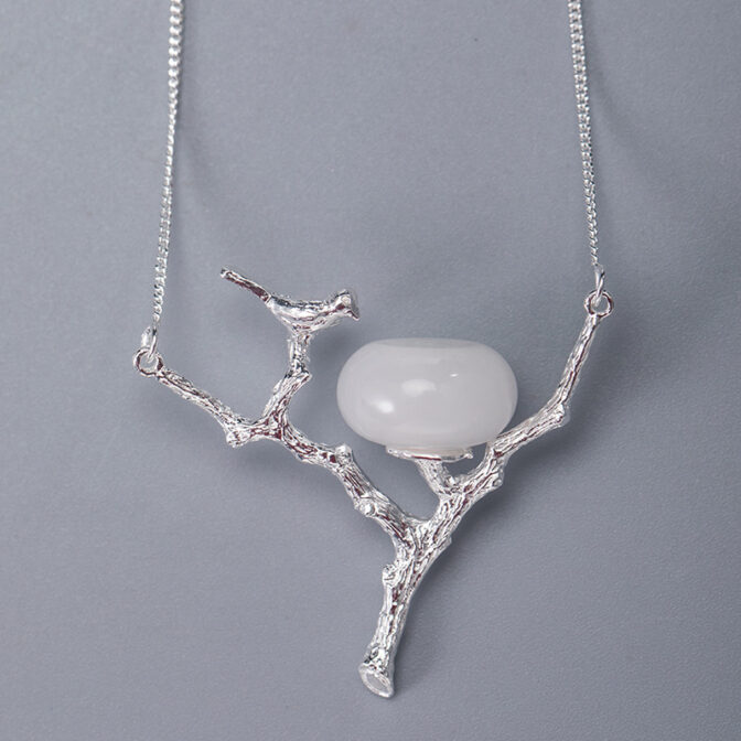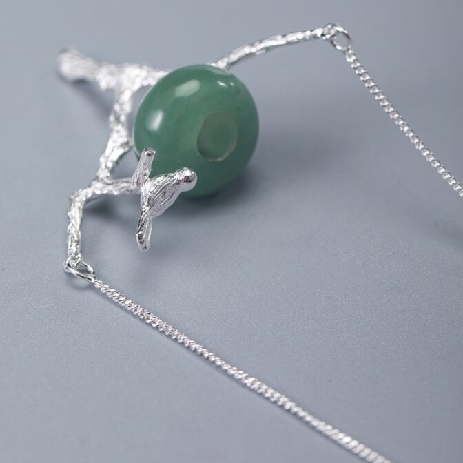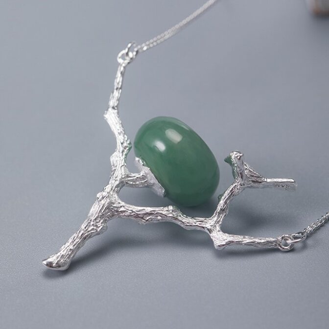 鳥が花の蜜を飲んでいる光景をペンダントにしました。スターリングシルバーの本体に、花は美しいネフライトにし、上品でエレガントな印象に。細部まで精密に作られた鳥と花は、見る人を魅了すること間違いなしです。