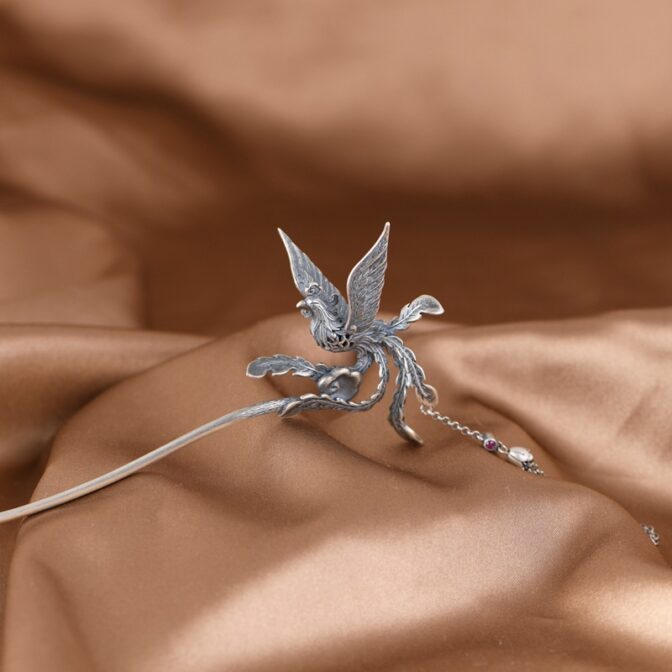 このように、鳳凰をモーチフにしたかんざしには、美しさや高貴さ、そして愛や幸運の象徴としての意味が込められています。ぜひ、このかんざしを身に着けて、特別な日や大切な場面で輝いてみてください。