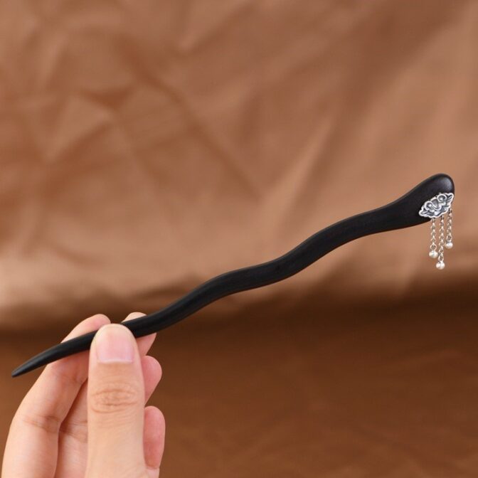 このかんざしは、和装にぴったりのエレガントなデザインです。黒檀の本体にシルバーの装飾が施しているため、上品で洗練された印象を与えます。