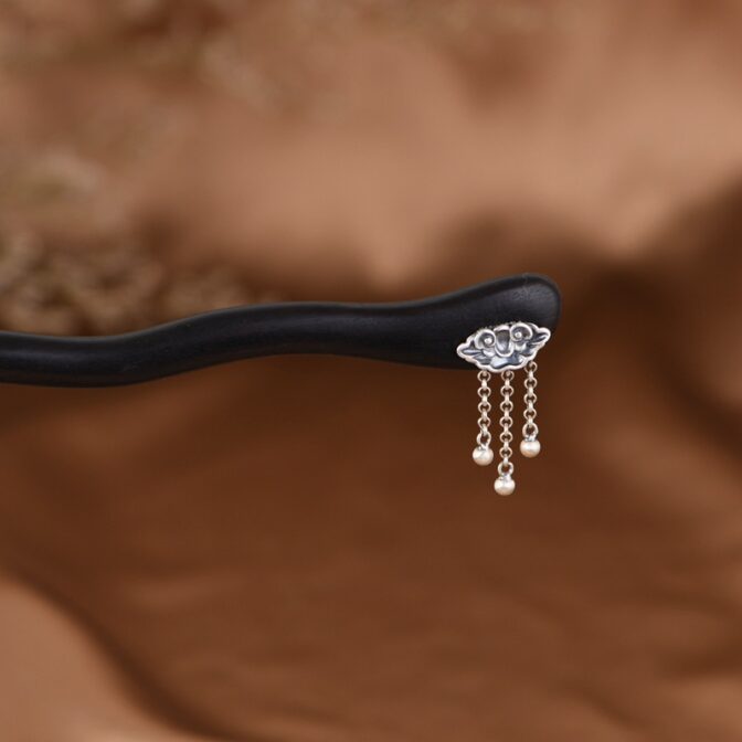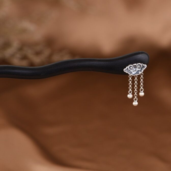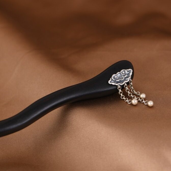 雲の形をした装飾が特徴的で、和の雰囲気を演出します。黒檀の本体は、高級感があり、手触りも滑らかです。シルバーの装飾は、かんざし全体を引き立たせるとともに、光沢感が美しく、輝きを放ちます。