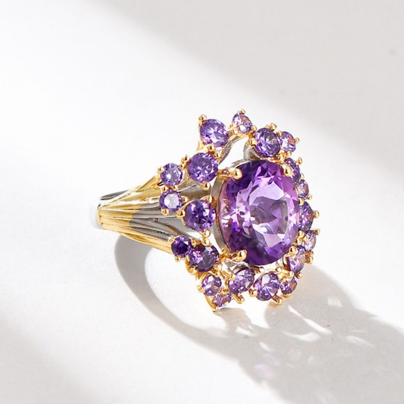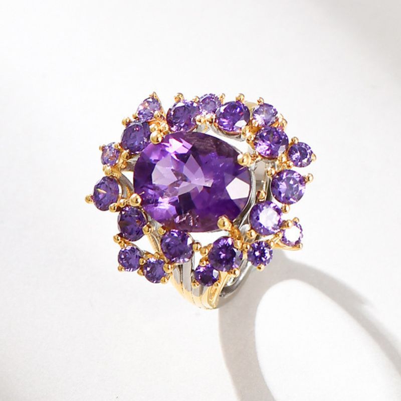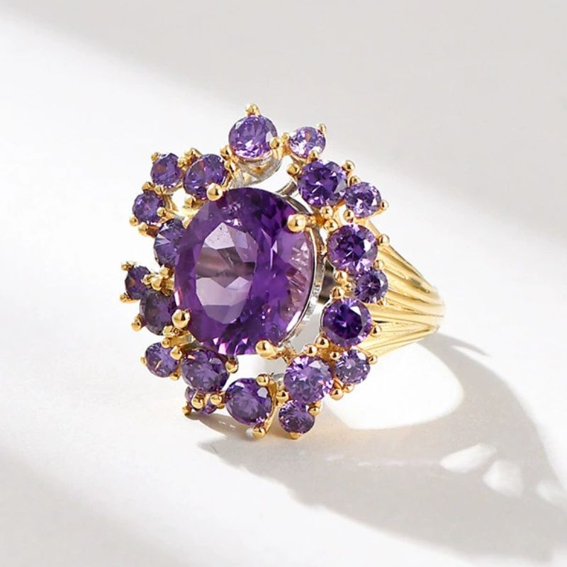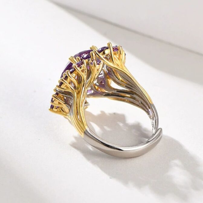 中央に深い紫色のアメジストが美しく配置され、周囲には優雅に散りばめられた上品なリングです。シルバーのバンドが石の美しさを一層際立たせ、手元に華やかさを加えます。特別な日だけでなく、日常の装いにも最適で、どんなシーンでも女性らしさを演出します。このリングを身につけるたびに、洗練された美しさと自信が自然に溢れ出ることでしょう。