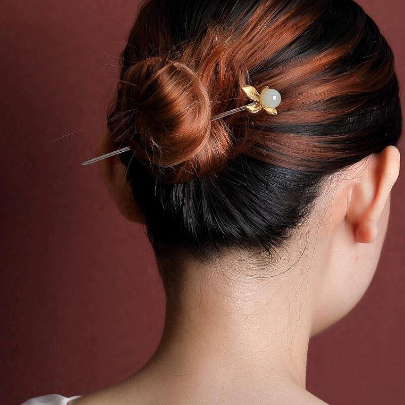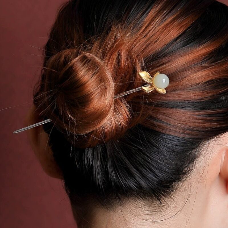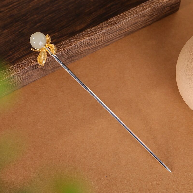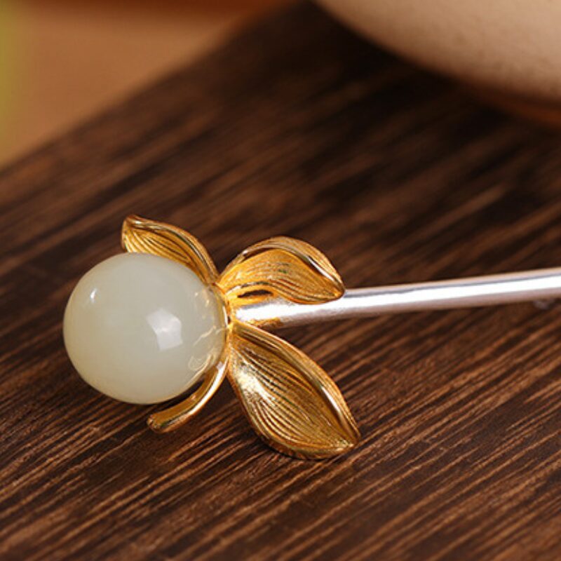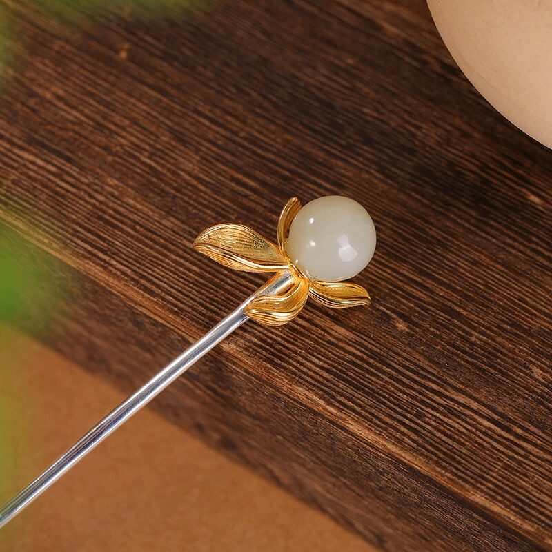 ハクモクレンをモチーフにしたかんざしは、風に揺れる花びらを見事に再現しています。中央にはネフライトをあしらい、より一層の上品さを加えました。また、このかんざしは、職人の手によって一つ一つ丁寧に作られています。自然の美しさをそのままに、使う人の個性を引き立てるデザインです。どの角度から見ても異なる魅力を放ち、特別な日の装いに華を添えることでしょう。このかんざしを身につければ、まるで春の風をまとっているような気分になることでしょう。