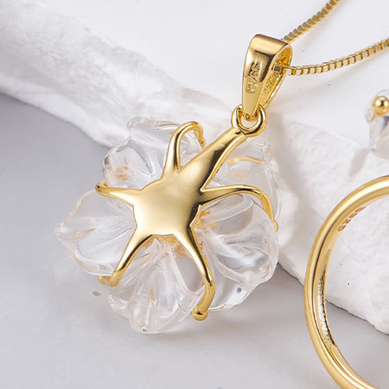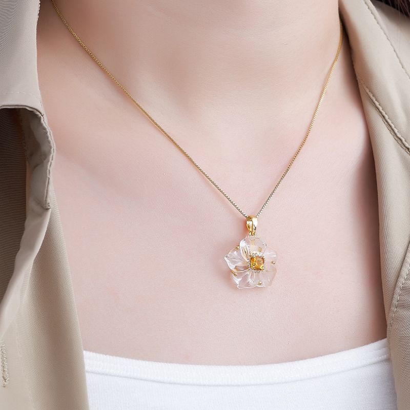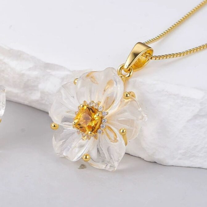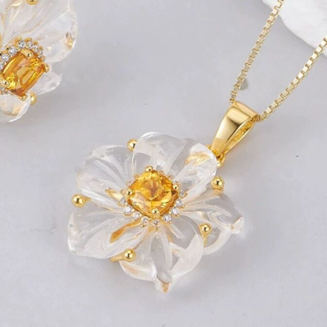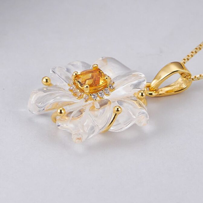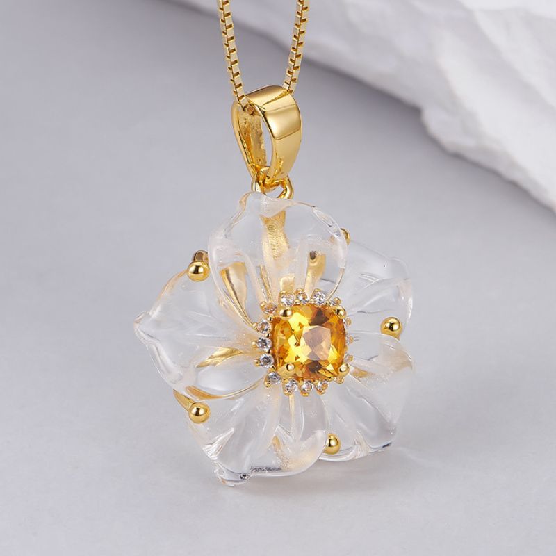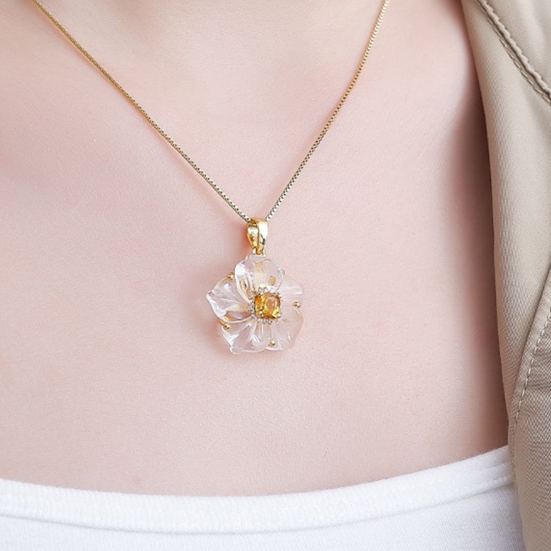 バイカイチゲをインスパイアしたペンダントで、水晶製の花びらにシトリンをあしらった洗練されたアクセサリーです。このペンダントは、まるで春の訪れを首元に纏うかのようなデザインで、見る人の心を和ませます。透明感のある水晶の花びらは光を受けて煌めき、その中心にあるシトリンは暖かみのある黄金色で、持つ人に豊かさと幸運をもたらすと言われています。このアクセサリーは特別な日にも日常使いにも最適で、身に着けることで自然の美しさを感じさせる一品です。