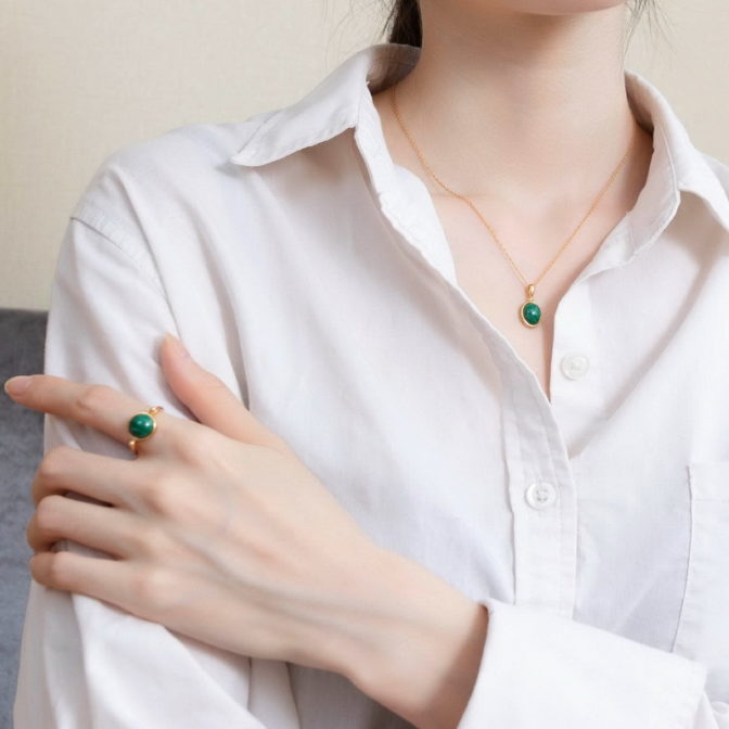 また、マラカイトが持つ独特の模様は魅力的で、光の当たり方によって様々な色調が浮かび上がります。ペンダントのチェーンは調節可能で、様々な服装に合わせることができます。