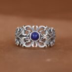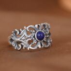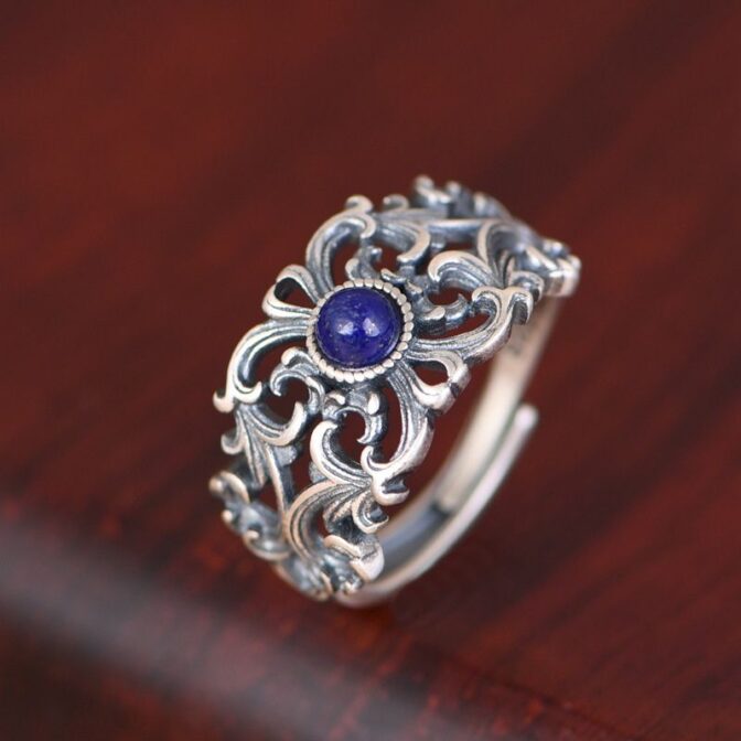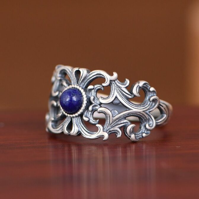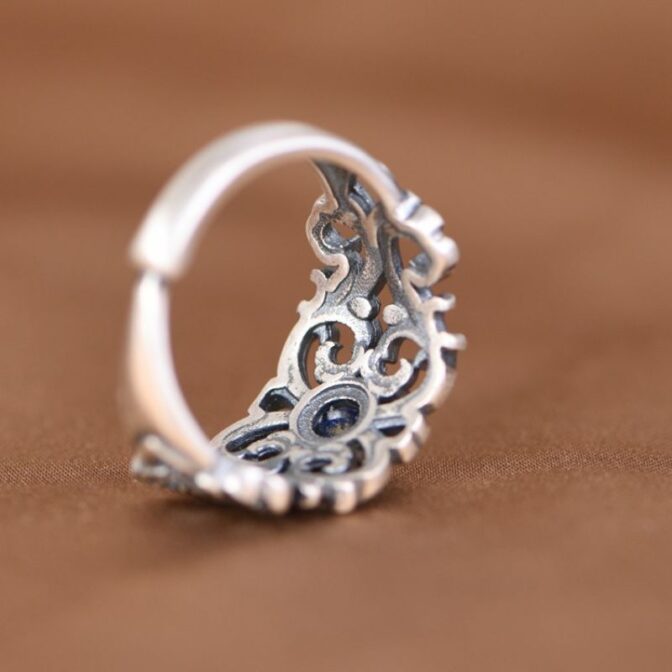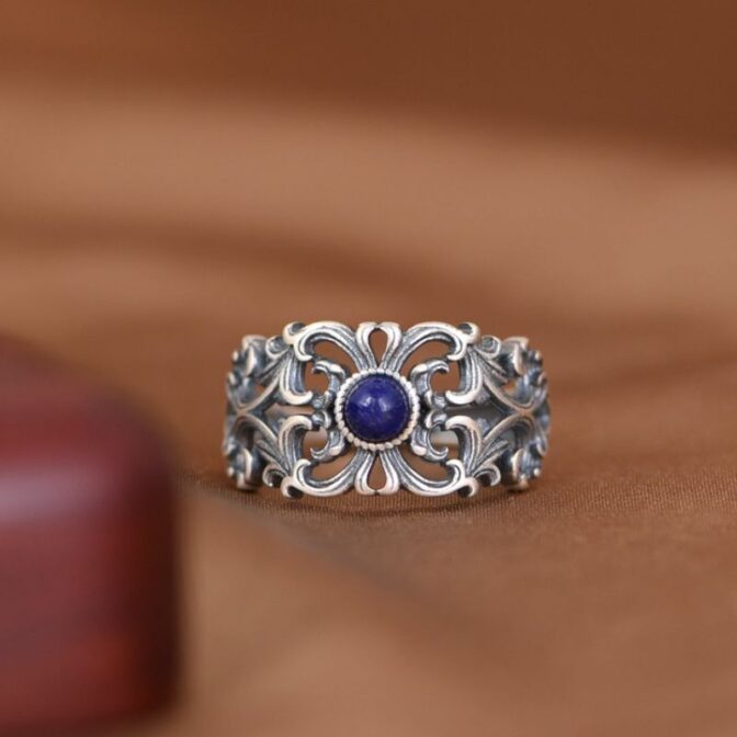 唐草モチーフの彫金リングは、唐草の美しさを最大限に引き出したアクセサリーです。中央にラピスラズリを配したアンティーク調のリングが完成しました。手に持つと、その重みと共に、職人の技術を感じることができます。ラピスラズリの深い青色は、リング全体に気品を与え、歴史の一部を手にしているかのような気持ちにさせてくれます。細部までこだわった唐草模様は、見る角度によって異なる表情を見せ、常に新たな発見があります。このリングは、特別な日の贈り物としても、自分へのご褒美としても最適です。どんなスタイルにも優雅なアクセントを加え、その人の個性を引き立てます。