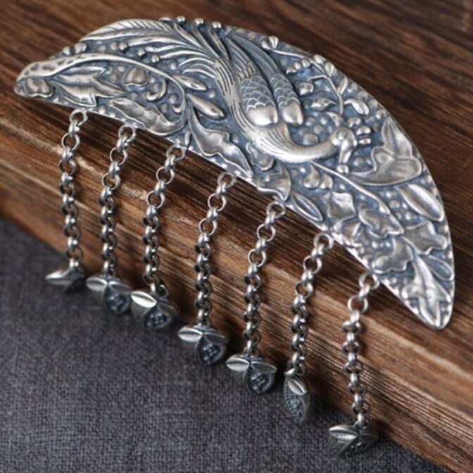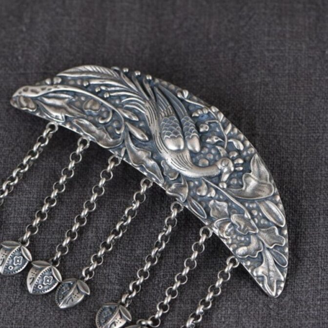 このバレッタは、特別な日に着けるととても素敵な印象を与えてくれます。孔雀の彫金が施しているため、上品でエレガントな印象を与えます。また、アンティーク調のデザインは、ヴィンテージの雰囲気を醸し出し、特別な雰囲気を演出してくれます。シルバー素材なので、どんな服装にも合わせやすく、様々なシーンで活躍してくれます。それぞれの女性の個性を引き立て、より美しく魅力的に見せてくれる素敵なアクセサリーです。