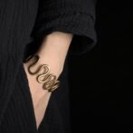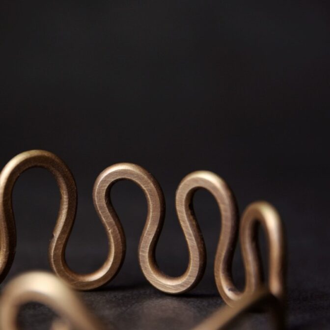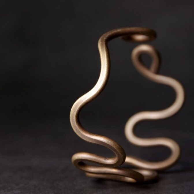 このバングルは、黄銅を曲げたりつぶしたりして形を整えています。そのため、手作り感がありながら、上品で格好良い仕上がりとなっています。