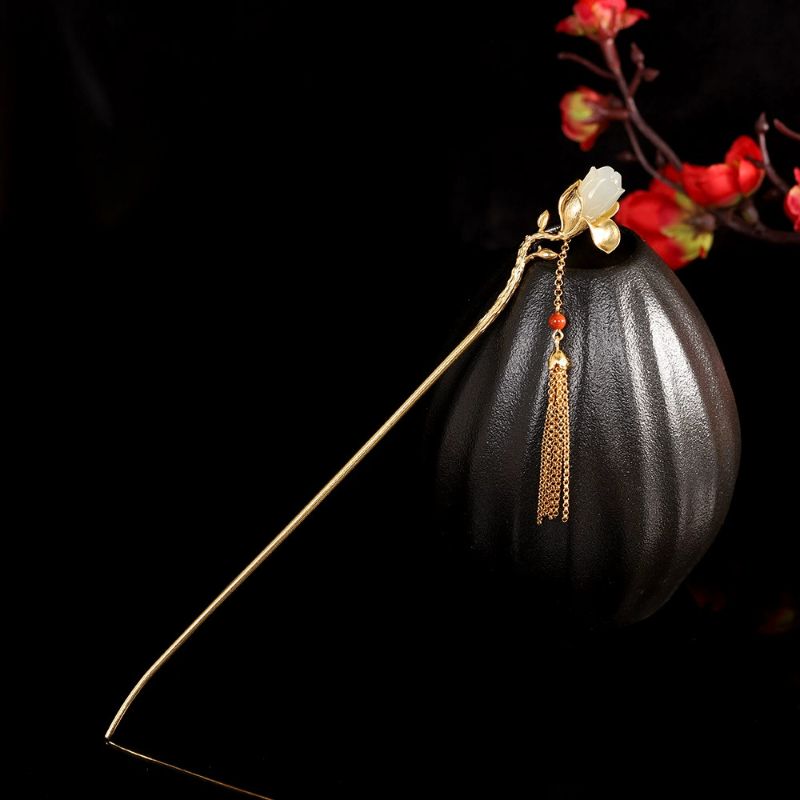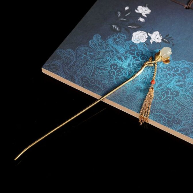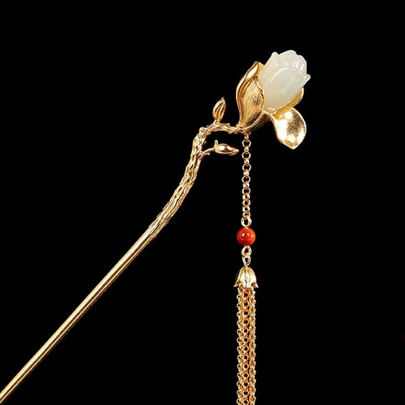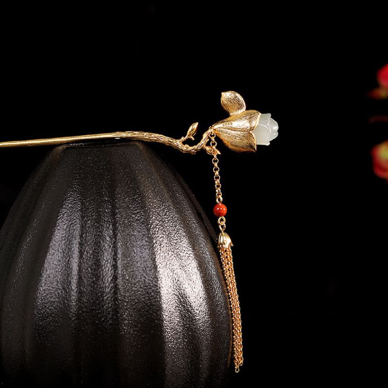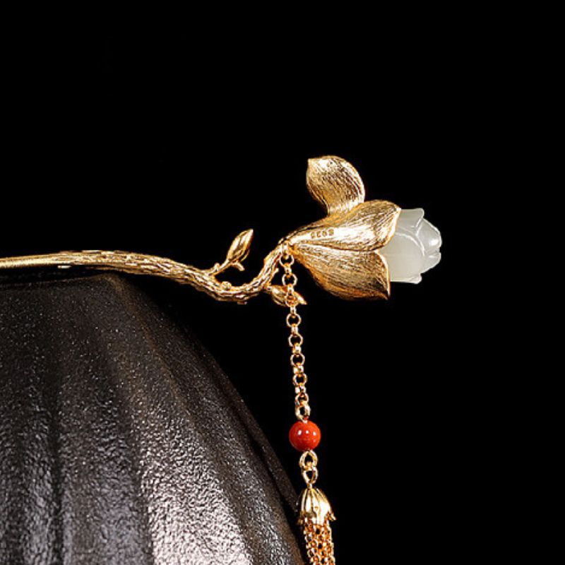 木蓮の花をテーマにしたかんざしで、花の部分にはネフライトとシルバーを組み合わせており、上品な仕上がりの髪飾りです。その美しいかんざしは、和装にも洋装にもぴったりで、特別な日をさらに華やかに演出します。ネフライト乳白色が木蓮の優雅さを引き立て、シルバーの輝きが上品さを加えています。このかんざしを身につけることで、伝統とモダンが融合した独特のスタイルを楽しむことができるでしょう。友人や家族への贈り物としても最適で、受け取った方の心をきっと温かくすることでしょう。