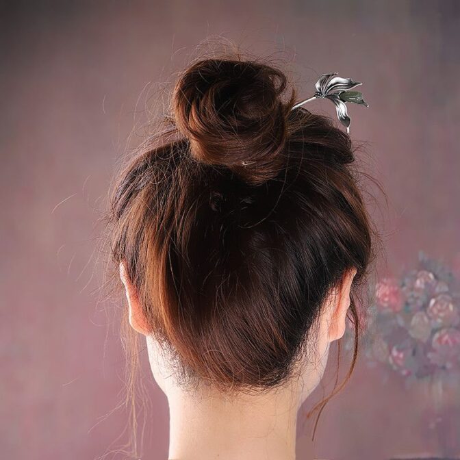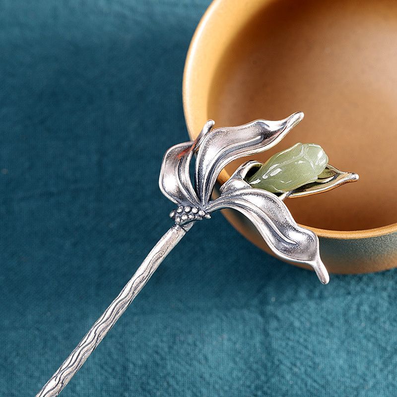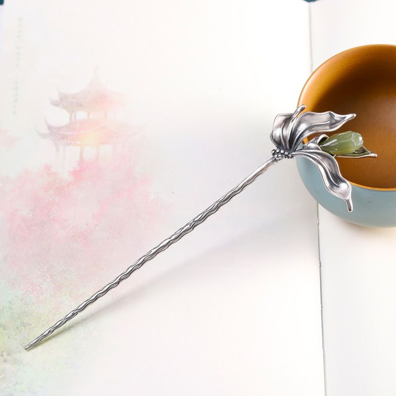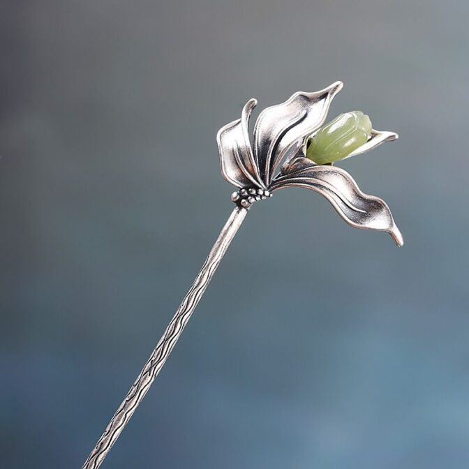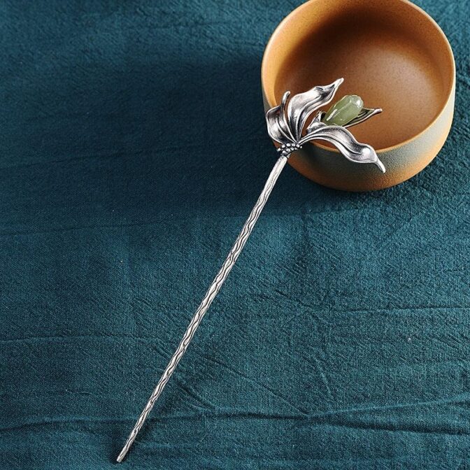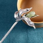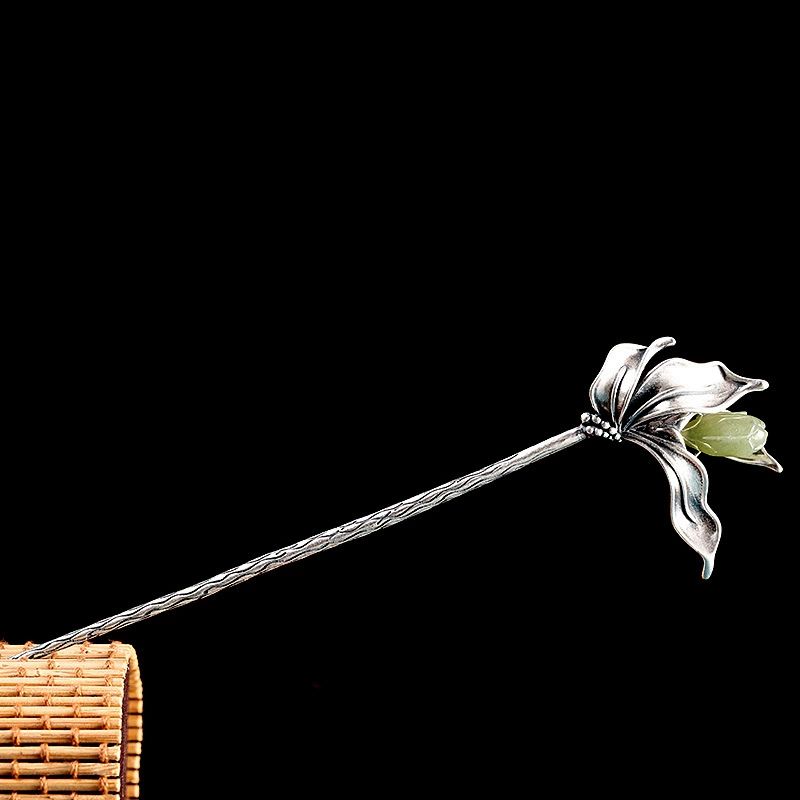 木蓮の花をテーマにしたかんざしで、花の部分にはネフライトとシルバーを組み合わせており、上品な仕上がりの髪飾りです。その美しいかんざしは、和装にも洋装にもぴったりで、特別な日をさらに華やかに演出します。ネフライト乳白色が木蓮の優雅さを引き立て、シルバーの輝きが上品さを加えています。このかんざしを身につけることで、伝統とモダンが融合した独特のスタイルを楽しむことができるでしょう。友人や家族への贈り物としても最適で、受け取った方の心をきっと温かくすることでしょう。