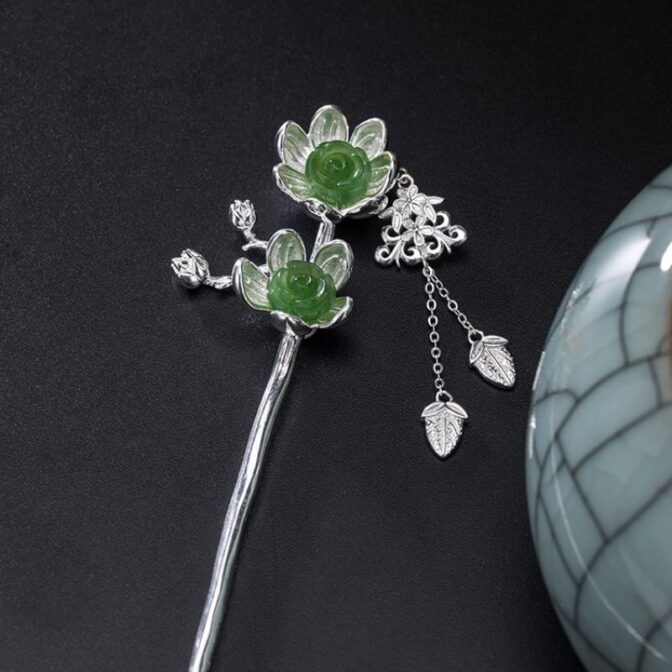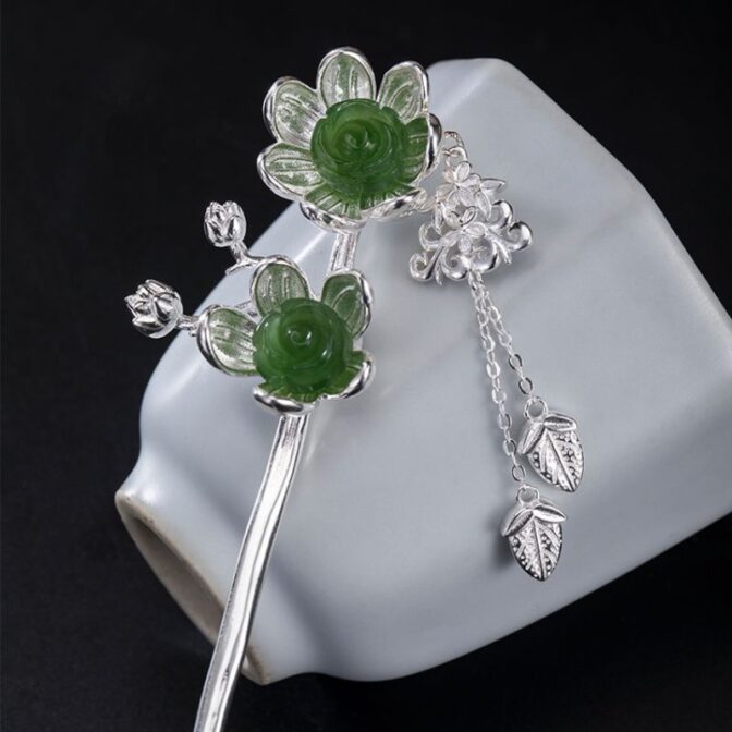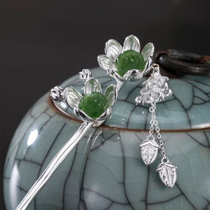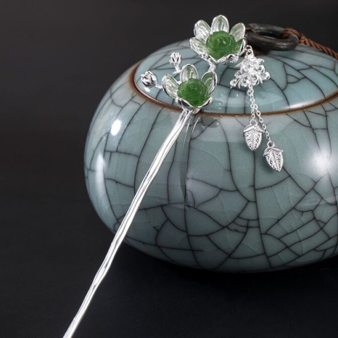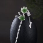 梅の花をモチーフにしたかんざしは、スターリングシルバーとネフライトを使用した繊細なアクセサリーです。そのデザインは、日本の春の美しさを象徴し、身につける人に新しい季節の訪れを感じさせます。梅の花びらが風に揺れる様子を思わせる職人の技により、細部にまでこだわりが表れています。ネフライトの緑色は、スターリングシルバーの輝きと調和し、清らかな雰囲気を演出します。このかんざしは、和装にも洋装にも自然に調和し、春の訪れを知らせる特別なアクセサリーとして、日常に彩りを添えてくれるでしょう。