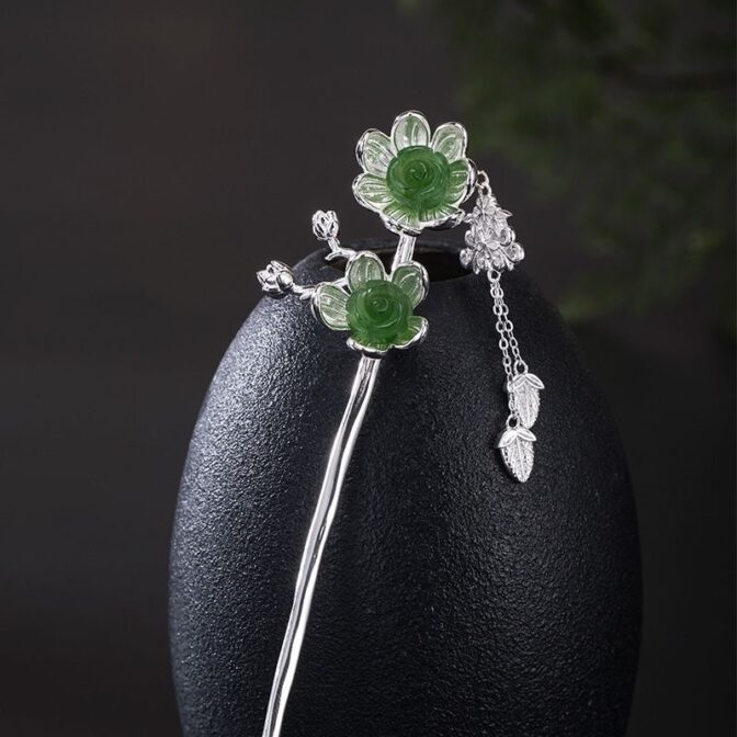 オリジナルアクセサリーシルバーかんざしネフライト(軟玉)梅の花