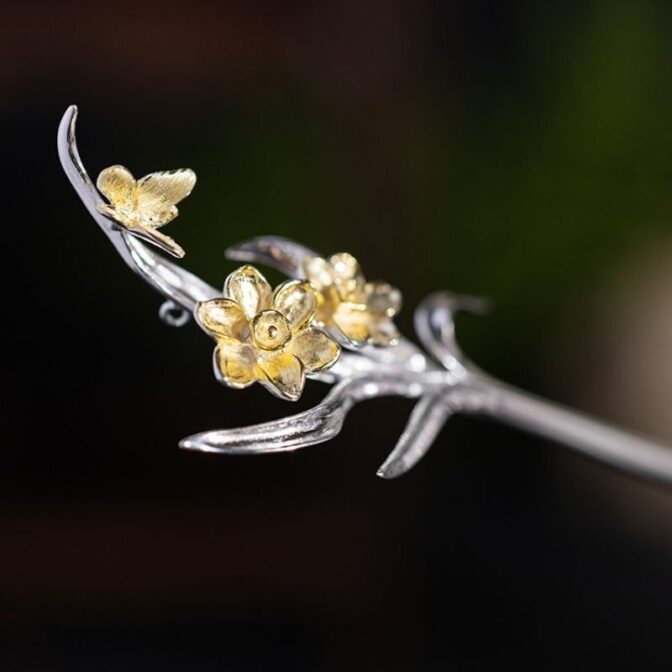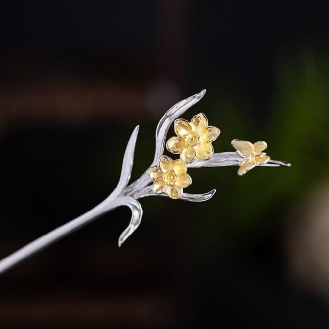 水仙の花のかんざしは、伝統的な美しさと現代的な感性が見事に調和しています。水仙の花びらは、繊細な彫刻と上品な色使いで、まるで本物の花が咲いているかのようです。葉っぱのデザインもまた、自然な形状と柔らかな曲線が魅力的で、全体に軽やかさと優雅さを添えています。このかんざしを身につけることで、装いに一段と華やかさが増し、特別な場面でも日常でも、洗練された印象を与えることでしょう。