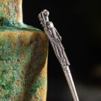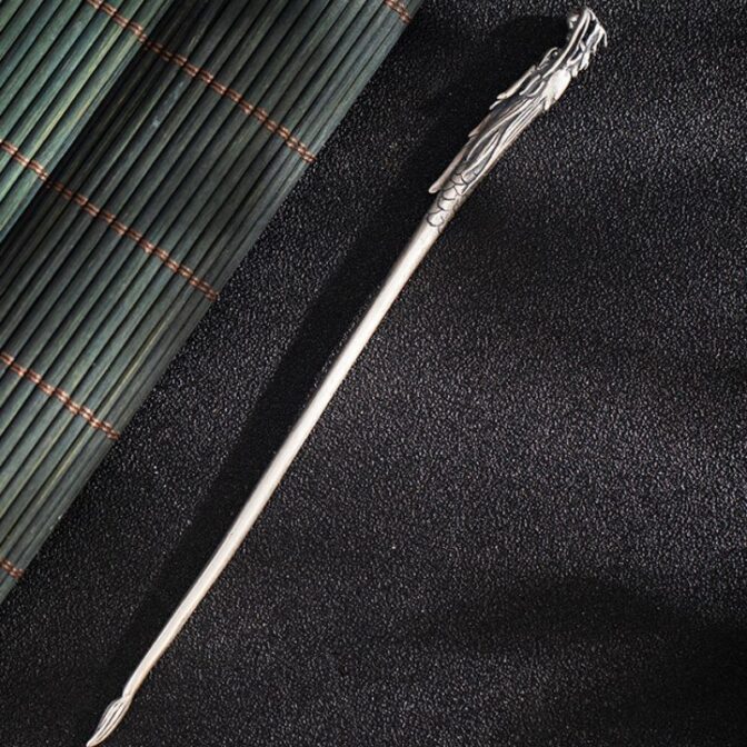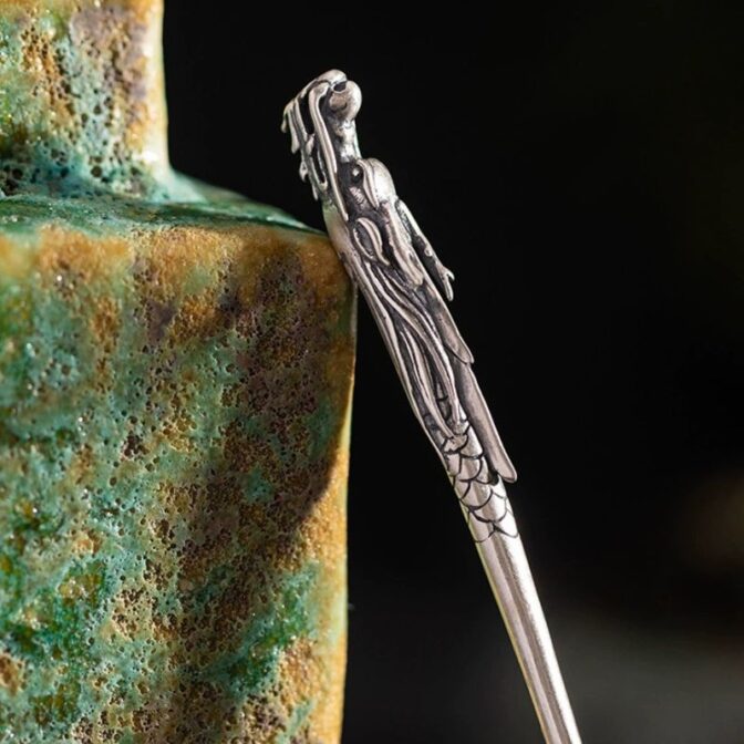 竜をテーマにしたこのかんざしは、素晴らしいヘアアクセサリーであり、竜の姿を生き生きと表現しています。その細工は隅々まで丁寧に施され、まるで竜が今にも飛び出してくるかのような迫力があります。鱗は光を反射し、見る角度によって異なる表情を見せるのが特徴です。このアクセサリーを身に着けることで、あなたの髪に神秘的な輝きを与え、特別な日をさらに華やかに演出してくれるでしょう。和装にも洋装にもぴったり合うこのかんざしは、ぜひあなたのコレクションに加えてほしい一品です。