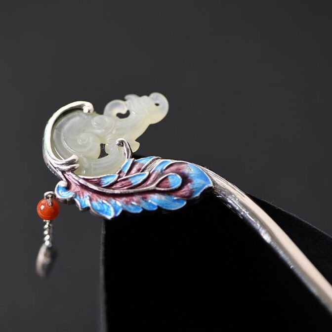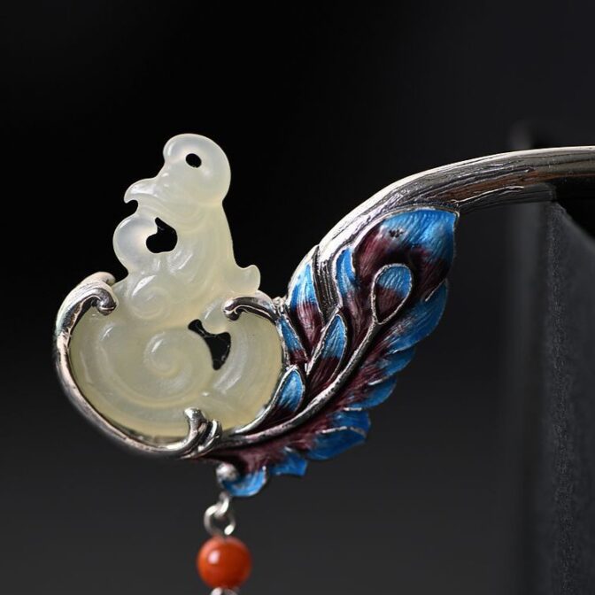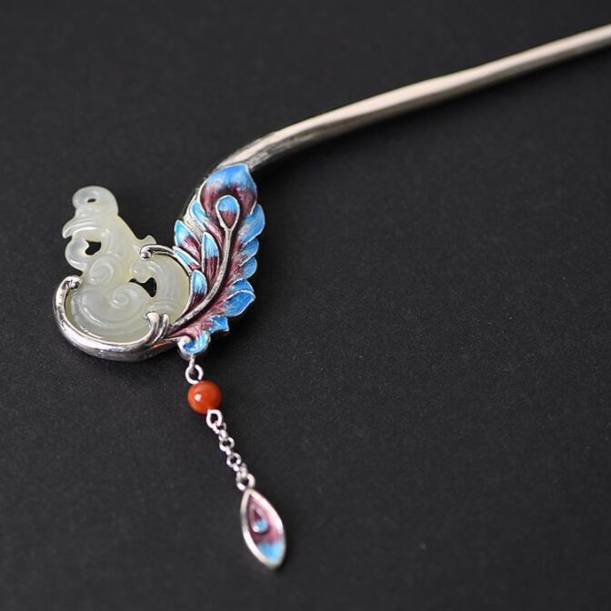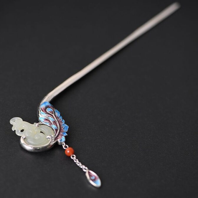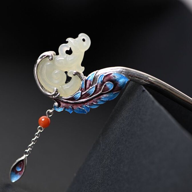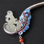 クジャクをモチーフにしたかんざしは、豪華で美しいデザインが魅力的です。本体には、緑色の宝石であるネフライトを使用しており、高級感があります。羽の部分には、七宝が施しており、細かな装飾が施しています。