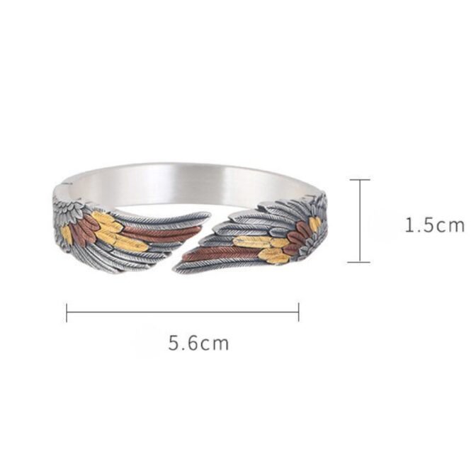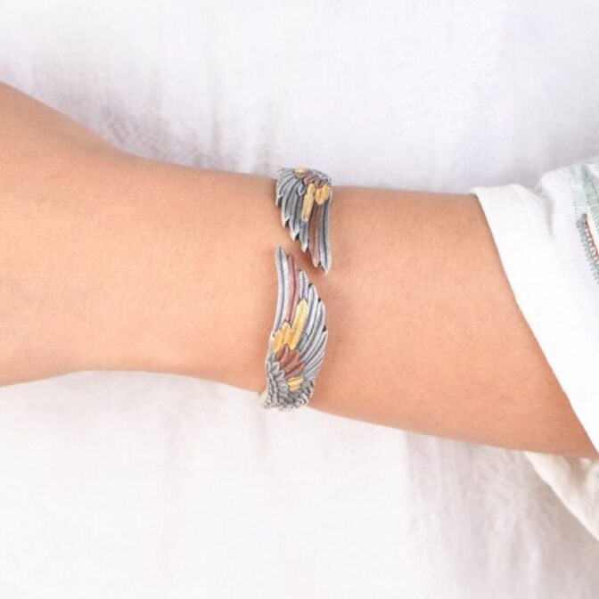 このバングルは、シンプルなデザインながらも、純銀ならではの豪華さと重厚感があります。羽の部分には細かな彫刻を施し、繊細なデザインが印象的です。手首に巻くと、存在感がある一品です。普段使いはもちろん、特別な場にもふさわしいアクセサリーです。大切な人へのプレゼントにもおすすめです。