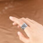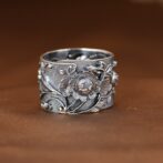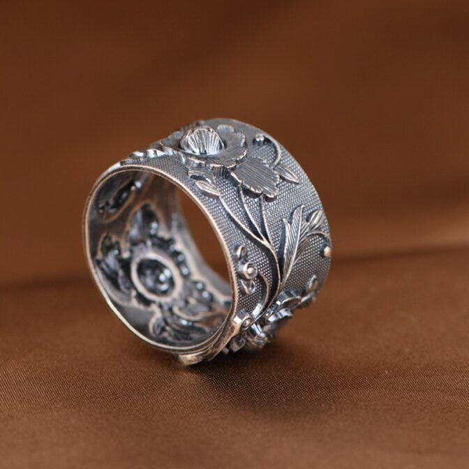 この牡丹のモチーフが施されたリングは、アンティークな雰囲気が漂っています。このリングは、様々な場面で活躍するアクセサリーとして、おしゃれな女性たちに人気があります。