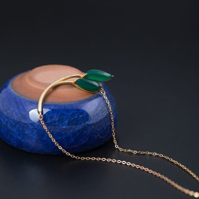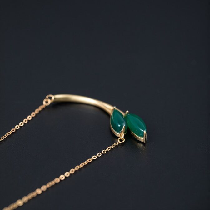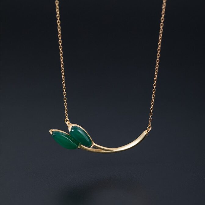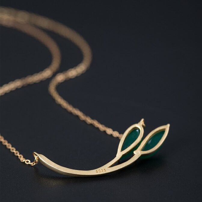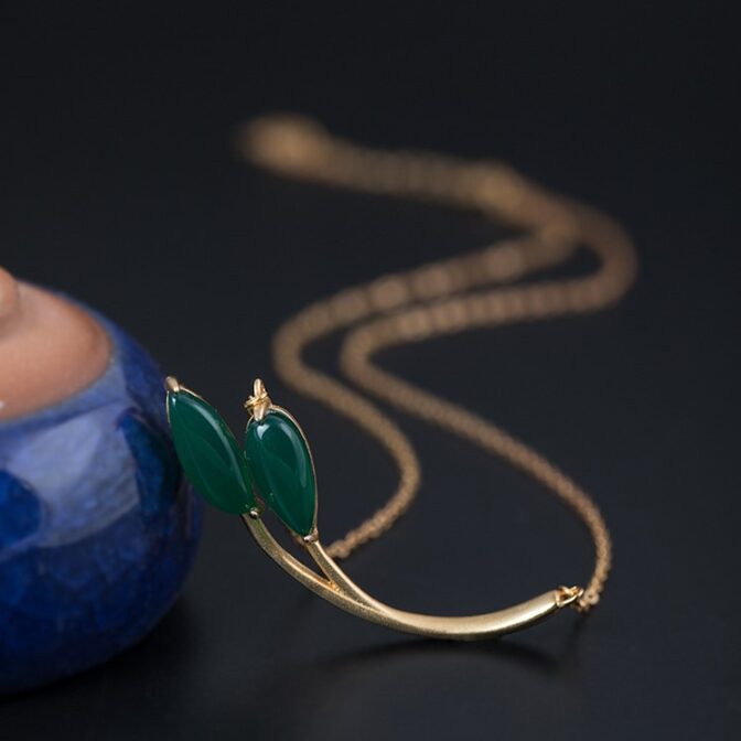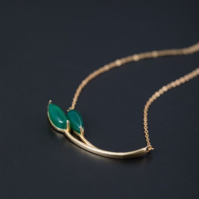 この葉っぱをモチーフにしたペンダントは、グリーンカルセドニーでできた葉っぱ部分がとても美しく、自然の中にいるような気分にさせてくれます。