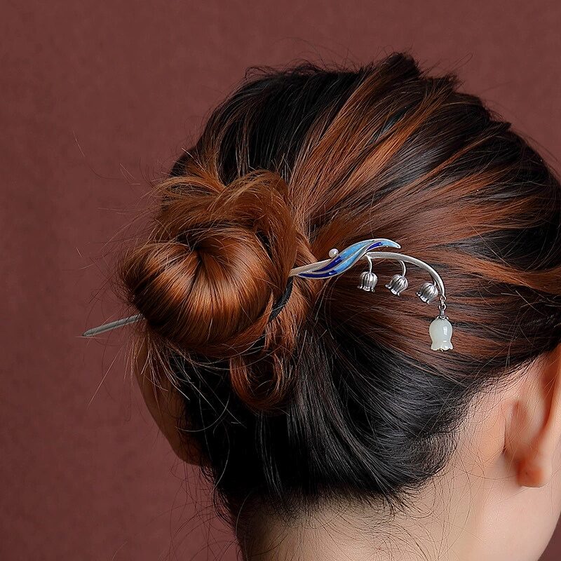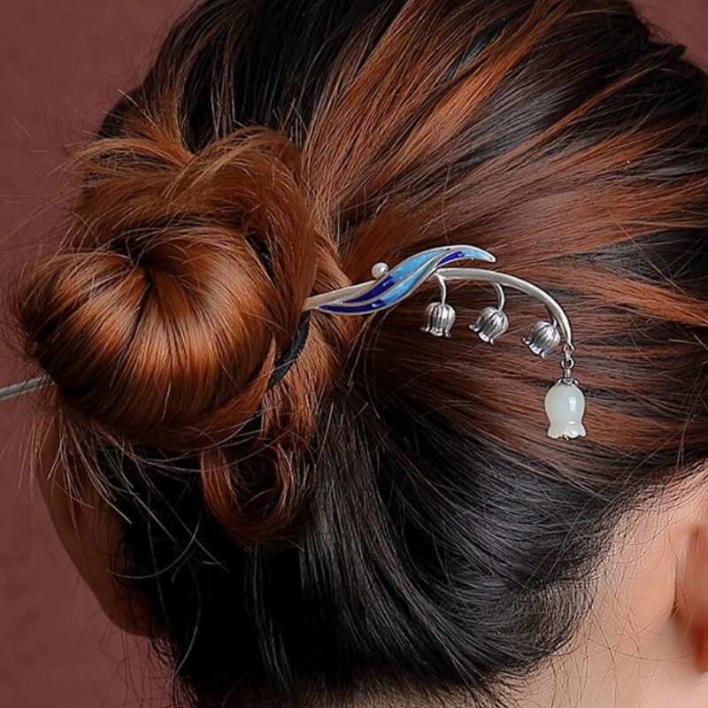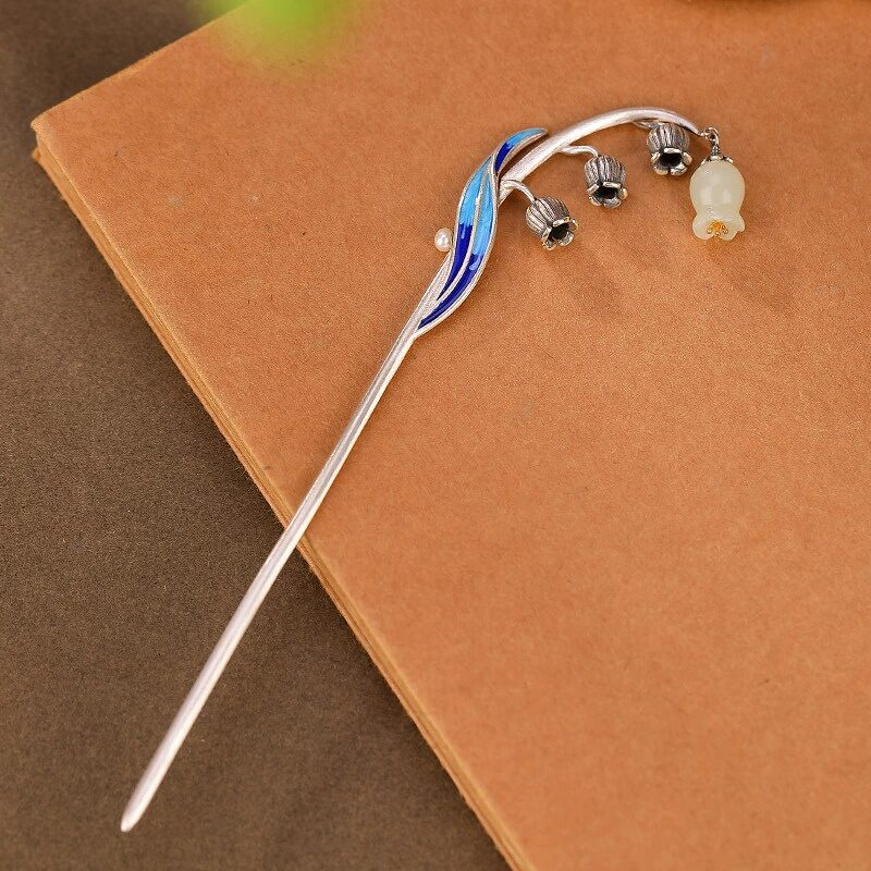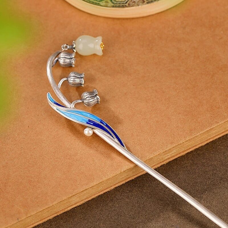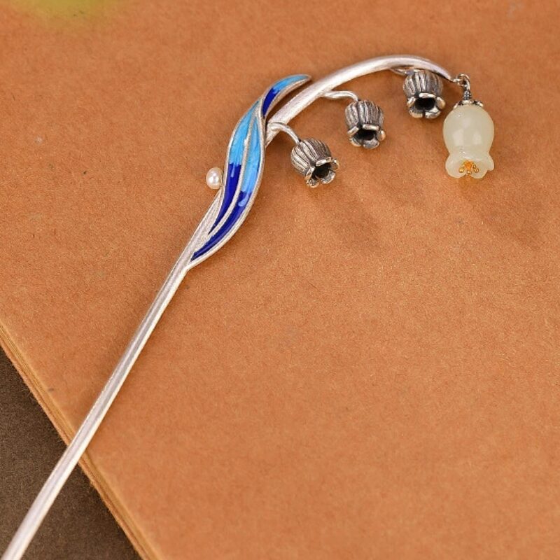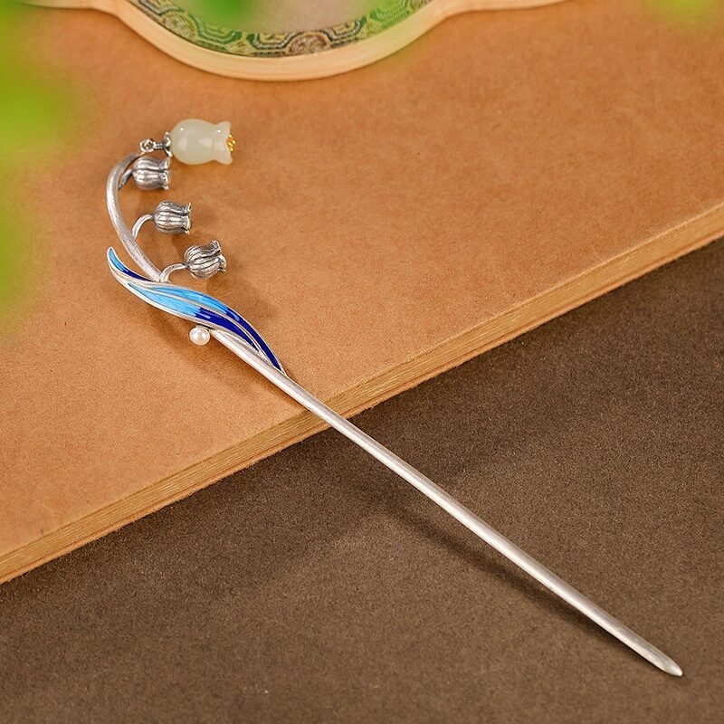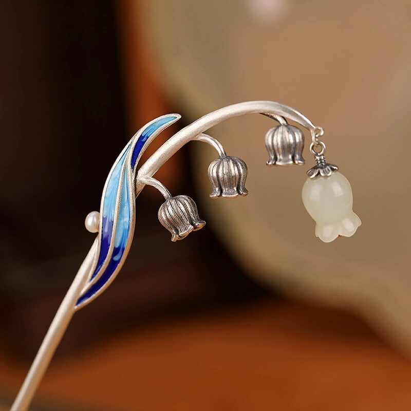 鈴蘭の花をテーマにしたかんざしは、花部分がネフライトで美しく表現され、葉は七宝焼きで仕上げられた上品なデザインです。この繊細なスタイルは和装を引き立てるだけでなく、着用する人に優雅さをもたらします。美しいコントラストがあり、どの角度から見ても上品な輝きを放ちます。このかんざしは特別な日の装飾に最適で、まるで自然の中に咲く本物の鈴蘭を身にまとっているような気持ちにさせてくれます。伝統と現代の美が融合したこのアクセサリーは、心を和ませ、見る人を魅了します。