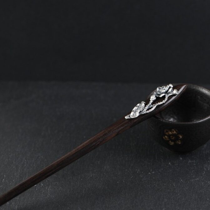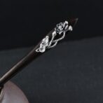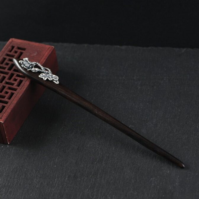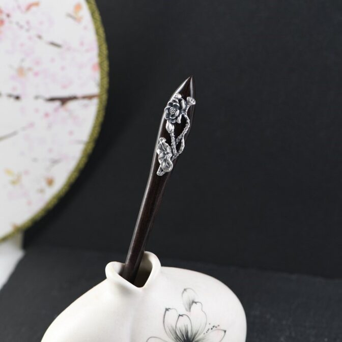 この素晴らしいかんざしは、高級感のある黒檀を本体に使用しています。そして、トップにはシルバーの細工が施しており、非常に美しく仕上がっています。