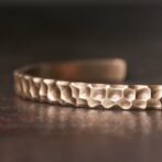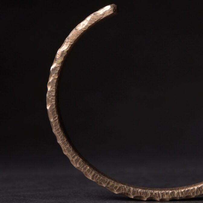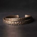 この黄銅バングルは、槌目のテクスチャーが美しく、素材の質感を引き立てています。様々なスタイルの衣装に合わせやすく、ファッションアクセサリーとしても優れています。
