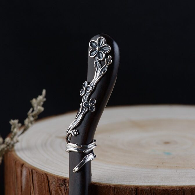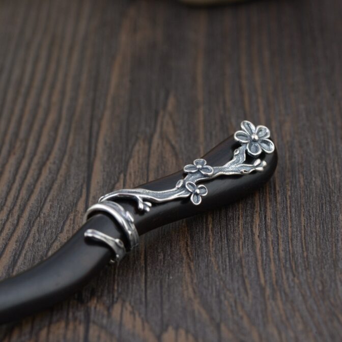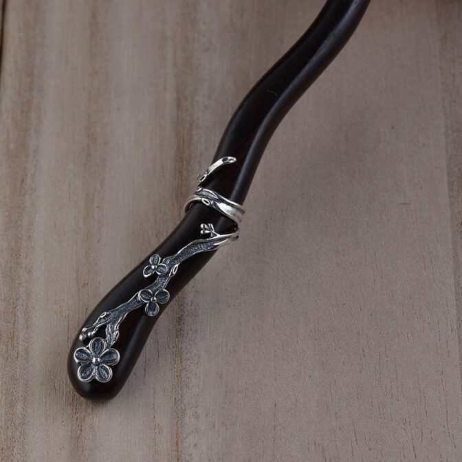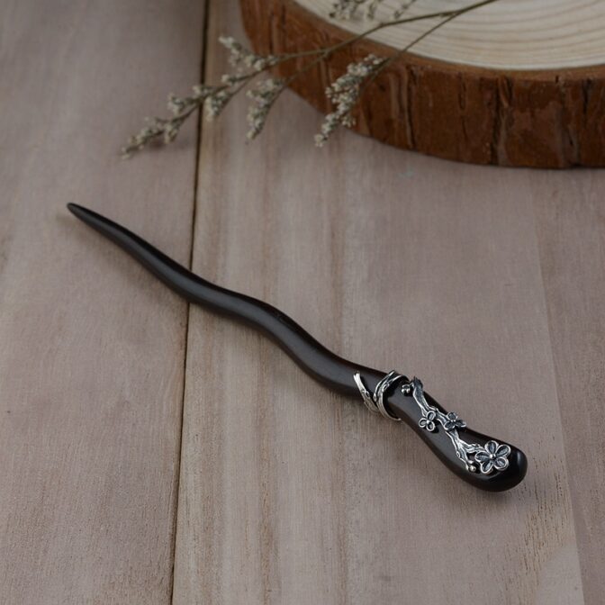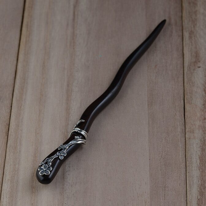 上品で美しいかんざしを紹介します。黒檀をベースにしており、梅の花をモチーフにしたシルバーのパーツが入っています。